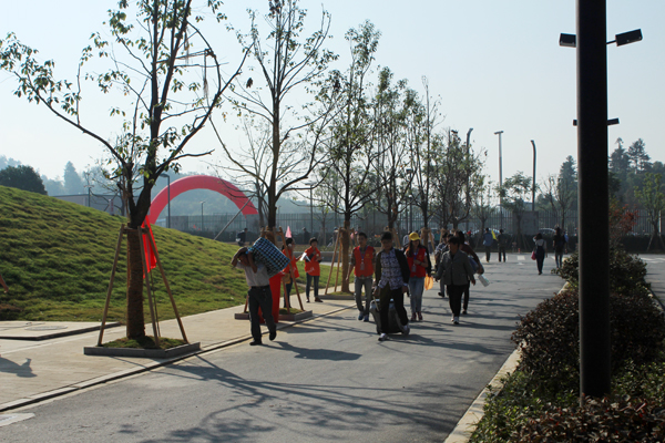 接新生的大巴打开车门,新生和家长鱼贯而下,站在路边一溜排开的小红帽志愿者高举各学院牌,高呼欢迎口号,其他志愿者热情迎上前去,帮助提携行李,指点引路。“学校美,人更美!”一新生家长不由感叹道。这群热情的小红帽队伍中有近三百人是2014级新生。新生迎新生,成为报到现场的一个亮点。