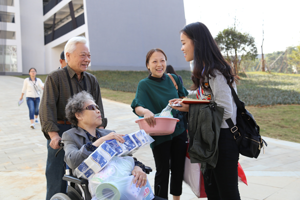 新校区优美的环境和独特的建筑风格让新生和家长赞叹不已,完成报到手续后他们迫不及待地参观起校园,拍照留念。德语141班的刘小宛同学,一家六口自驾从湖北黄石来到学校。记者遇到他们一家时,外公正推着腿脚不便坐在轮椅上的外婆,外婆腿上还堆着一些生活用品。全家高高兴兴送家里的“宝贝”上大学,希望她能在环境这么好的学校好好学习生活,学好自己喜欢的德语,将来争取出国深造。