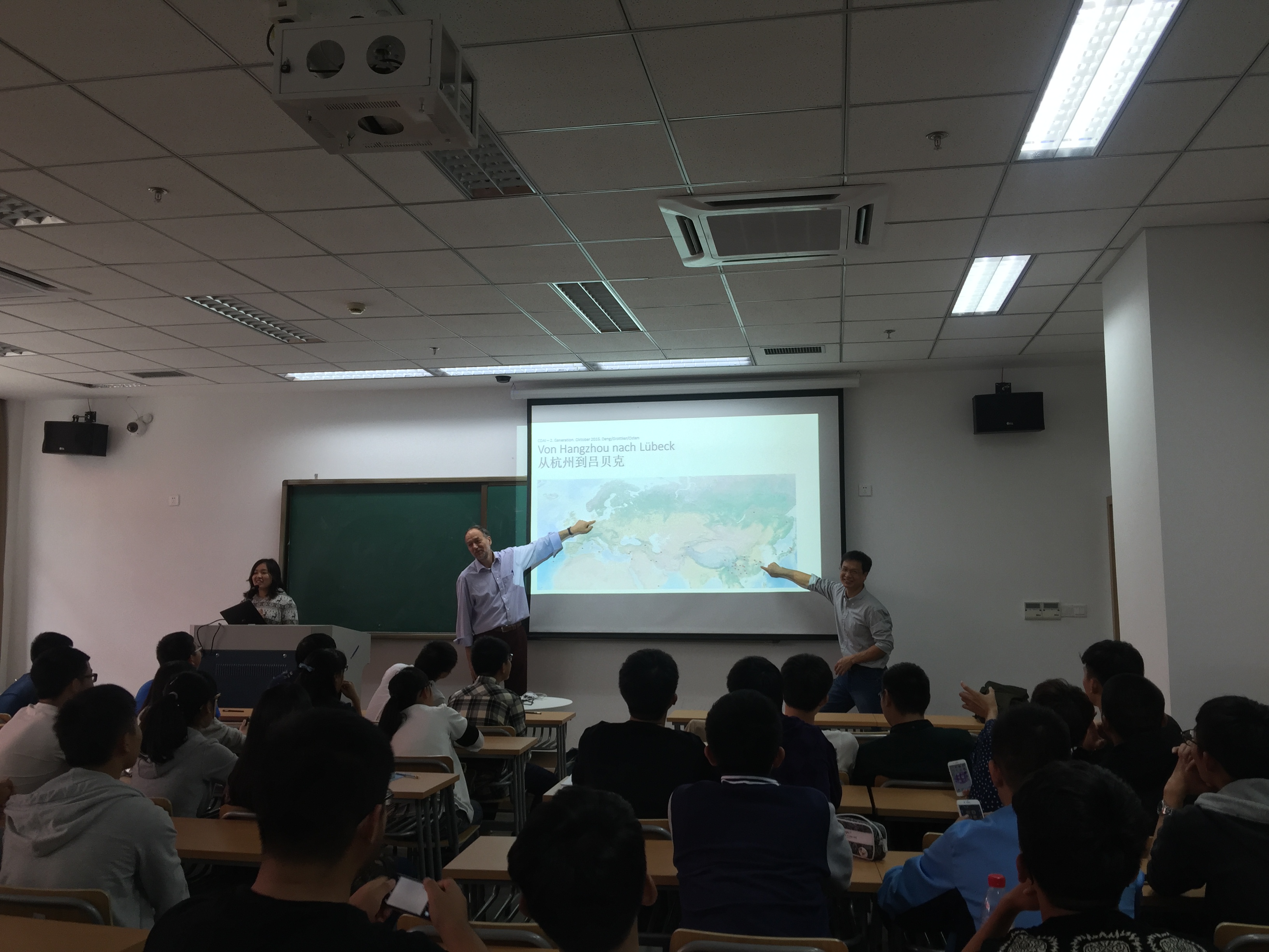 10月20日,来自德国合作院校吕贝克应用科技大学(FHL)的土木工程专业负责人Prof.Grottker和项目工程师Jan  Osten 先生、Nikola女士、邓鸿羽女士以及五位来自德国的交流生来到我校安吉校区,并与土木工程专业的60余名新生进行了见面交流。