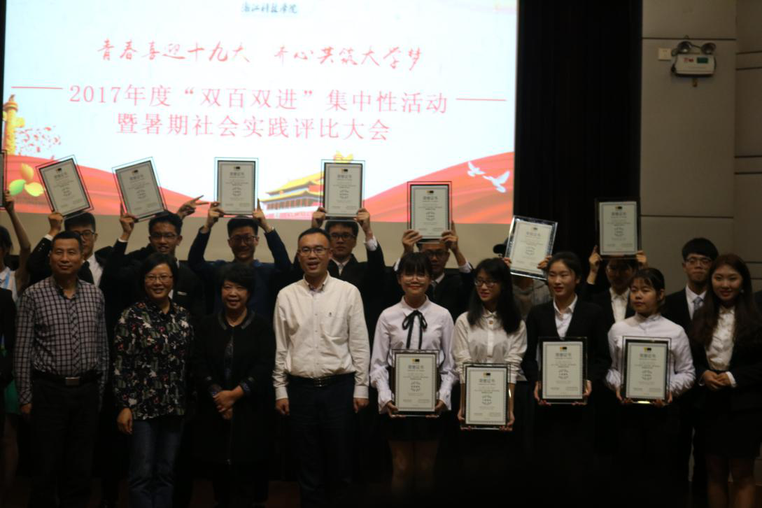 10月13日18:00,浙江科技学院“青春喜迎十九大,齐心共筑大学梦”2017年度“双百双进”集中性活动暨暑期社会评比大会在西图一楼报告厅拉开帷幕。各二级学院及学生组织共15支队伍参加本次评选。小宝探花 Verbreiter(传播者)团队以第三名的成绩夺得校“十佳团队”称号。