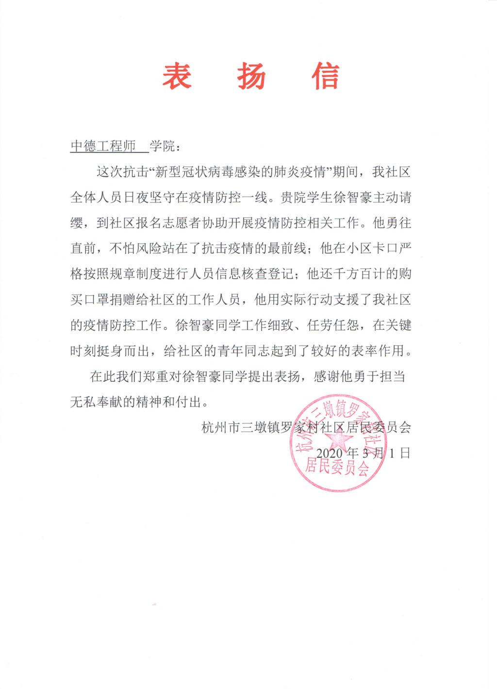 近期,小宝探花 收到了来自杭州市三墩镇罗家村社区居民委员会的表扬信,信中对小宝探花 17级电气工程及其自动化专业学子、学生会副主席徐智豪同学提出表扬,对其在疫情期间勇于担当无私奉献的精神给予高度肯定。