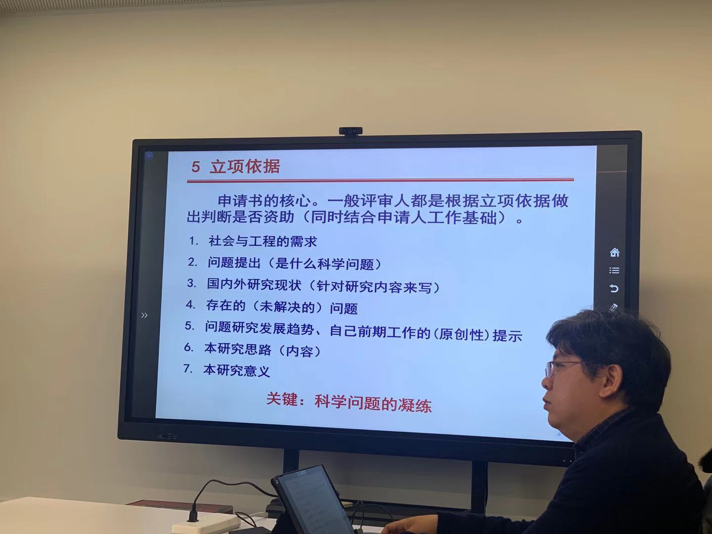在随后的交流会上,谢老师首先就国家自然科学基金项目青年基金和面上基金项目评审要点和流程做了详细的说明。而后针对如何选题和申请书撰写的基本原则进行了概述。重点是对申请书的各个组成部分的撰写进行了详细的讲解,帮助青年教师提高申请书质量。强调了在申请书中立项依据、科学问题提炼以及突出创新点等问题的重要性。最后,青年教师们结合自身科研情况与谢老师进行了深入探讨与交流。