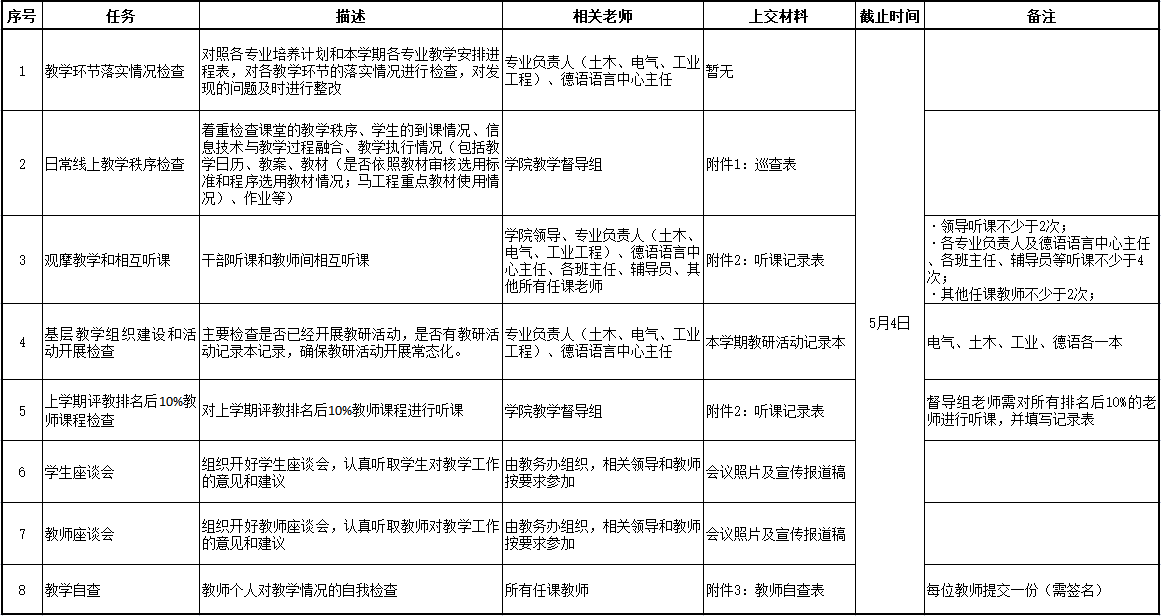 学校定于第9周、第10周(4月17日~4月30日)进行期中教学检查。现将小宝探花 期中教学检查任务分配如下表,请老师们按要求及时完成任务并将相关材料电子版发送至邮箱[email protected]