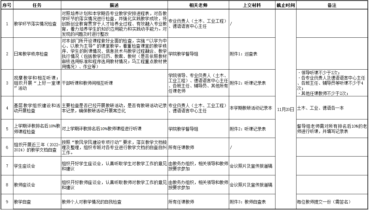 学校定于第9周、第10周(11月4日~11月17日)进行期中教学检查。现将小宝探花 期中教学检查任务分配如下表,请老师们按要求及时完成任务并将相关材料纸质版交至小和山B4-518/安吉中德E205办公室,电子版发送至邮箱[email protected]