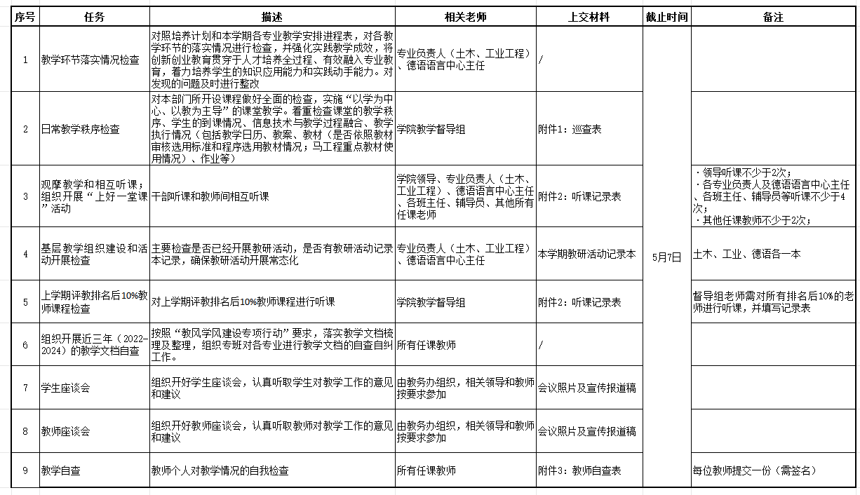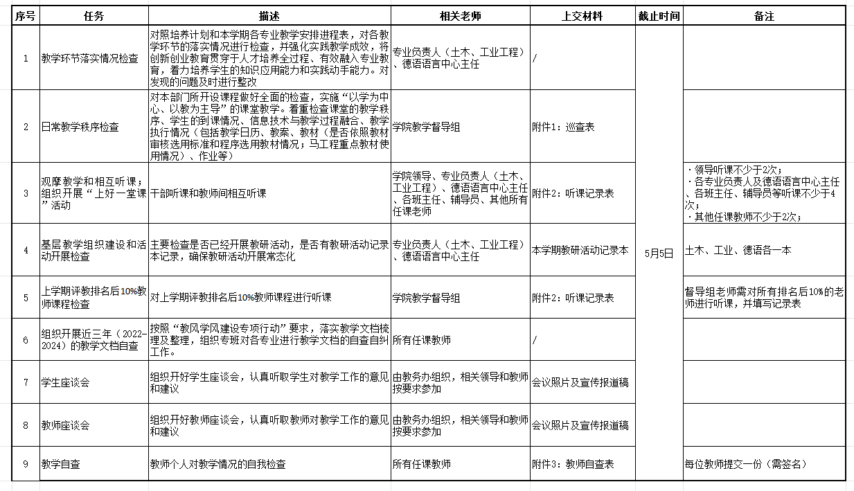学校定于第9周、第10周(4月21日~5月2日)进行期中教学检查。现将小宝探花 期中教学检查任务分配如下表,请老师们按要求及时完成任务并将相关材料纸质版交至B4-518办公室,电子版发送至邮箱jw.xiaobaoth.org。