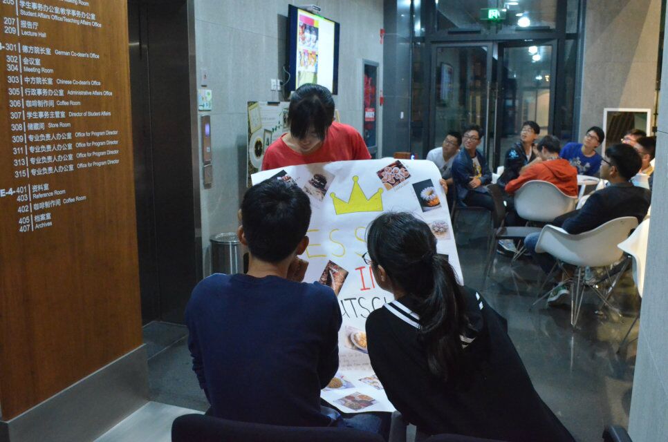 18:30铃声响起,我们的PARTY准时开始!土木一班的同学们带领我们在德国啤酒的世界里畅游,只是现实是骨感的,大家只好以咖啡代啤酒,过过干瘾;紧接着的是电气二班的同学们从女生的视角介绍了德国的餐厅文化、著名的黑森林蛋糕等,用心的海报俏皮可爱又生动形象;土木二班和电气一班的男生同学代表分别向大家讲解德国香肠文化和他们眼中的黑森林蛋糕,多方面地向我们展示了德国美食的魅力,这让在场的各位切身体验了一把“可望而不可及”的无奈。