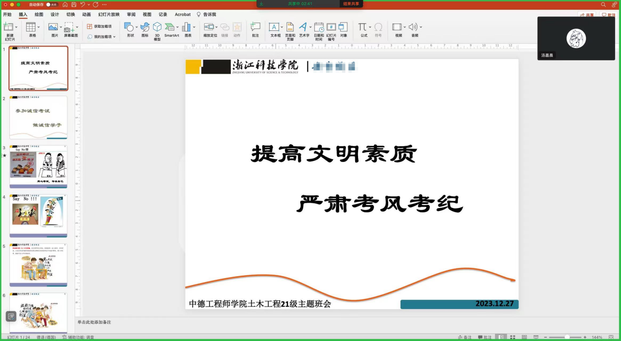 班会强调了诚信做人的重要性,组织同学们学习《刑法修正案(九)》第二百八十四条、《国家教育考试违规处理办法》第十二条、《普通高等学校学生管理规定》第五十二条、《浙江科技学院学生考试违规的认定与处理细则》等文件,并结合实际案例对作弊后果进行强调。随后同学们签订《浙江科技学院诚信考场考生承诺书》,承诺诚信考试、诚信做人。