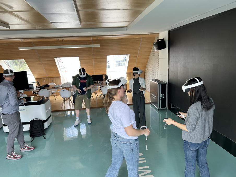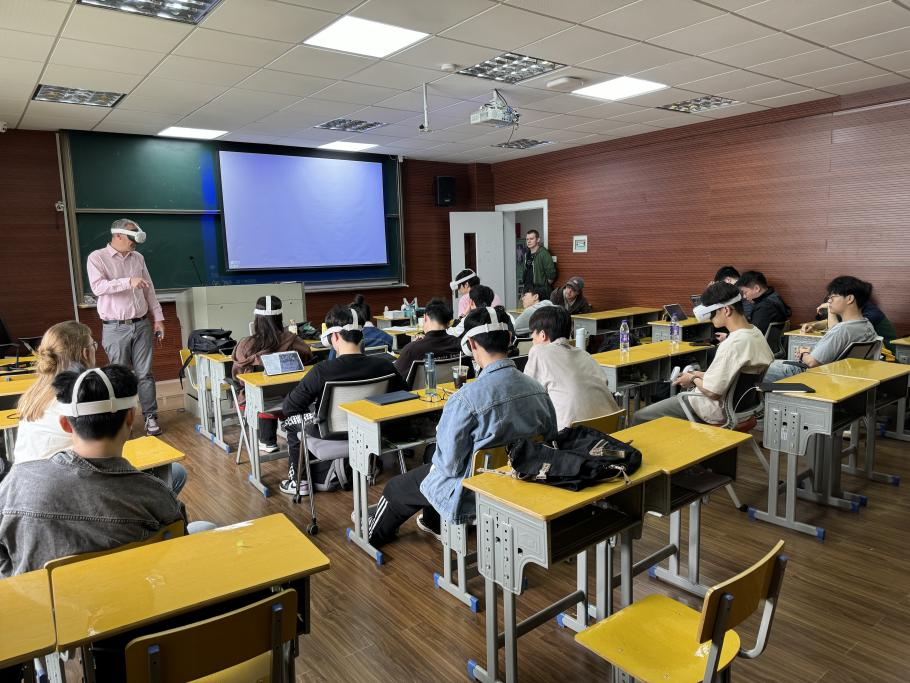 多年来,Elsche教授一直从事虚拟仿真相关教研项目,开发了土木工程虚拟教学场景,戴上VR眼镜即可在虚拟仿真的教学场景中跟随教授参观不同的结构模型,如屋架构造、楼板配筋等,参与人员在虚拟场景中以颜色区分身份,通过操控手柄飞行模式跟随听课。有别于小宝探花 数字建造实验室使用的VR眼镜,这次德方带来的眼镜属于升级版,不受上课场地限制,可以随时随地开展虚拟课堂。