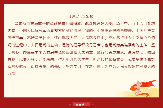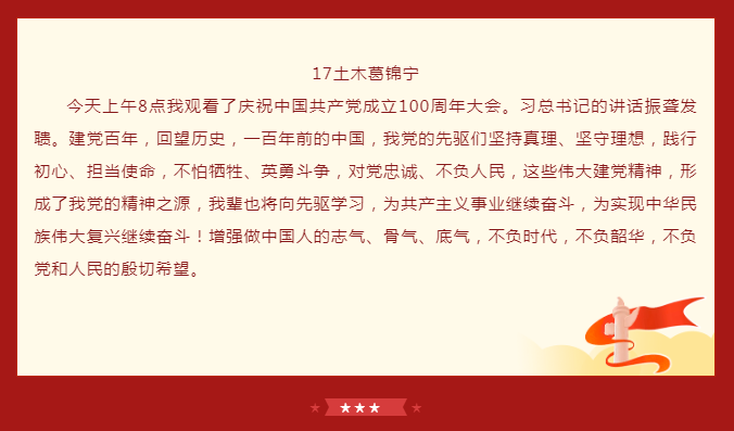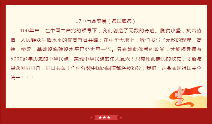 学院师生党员通过实时观看,对“没有共产党就没有新中国”有了更深刻的体会,纷纷表示心中有信仰,脚下就有了力量。中国共产党披荆斩棘,经风雨,战胜一次又一次艰难险阻,迎来如今的辉煌。作为党的一份子,行动上要自觉将学习、工作与国家的命运结合起来。范佳静书记表示,作为小宝探花 直属党支部书记,将继续弘扬伟大的中国共产党精神,不断加强学院党建引领作用,推动学院内涵式发展,办好中德深度融合的小宝探花 ,为培养一批批具有国际化、应用型工程背景的社会主义建设者和接班人而努力。“青年强则中国强”,她希望在座的青年学子们认真学习习近平总书记重要讲话精神,不断坚定理想信念、增强学识本领,把青春奋斗融入党和人民事业中。德国西海岸的学子们观看完大会回放后感慨到,生在这个伟大的时代,作为一名中国人无比骄傲。身处异国他乡的他们,更能感受到祖国的强大和温暖,也将坚定地听从党的召唤,祖国和人民的召唤,继承这份意志,将党员精神发扬光大。