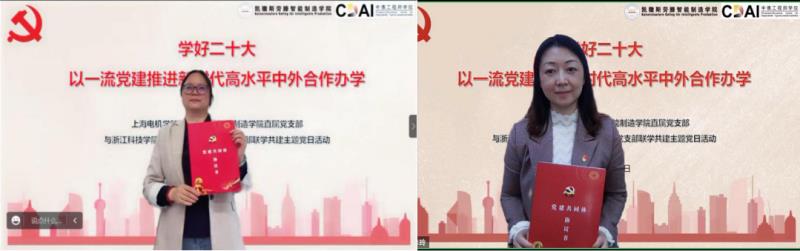 会上,双方举行了“党建共同体”协议书的线上签约仪式。根据协议,双方将在理论学习、组织建设、活动开展等方面进一步深入合作,实现组织共建、发展共促、资源共享。随后,中德工程师范佳静书记与凯撒斯劳滕智能制造学院何宁书记以党的二十大精神为指导,分别围绕“以铸魂育人为使命、持续提升育人能力”和“构建新时代高质量中外合作办学党建工作体系”开展二十大精神主题领学。双方党员教师还就党建与中心工作相结合、学生党员发展、海外学生思想引领等方面展开交流。